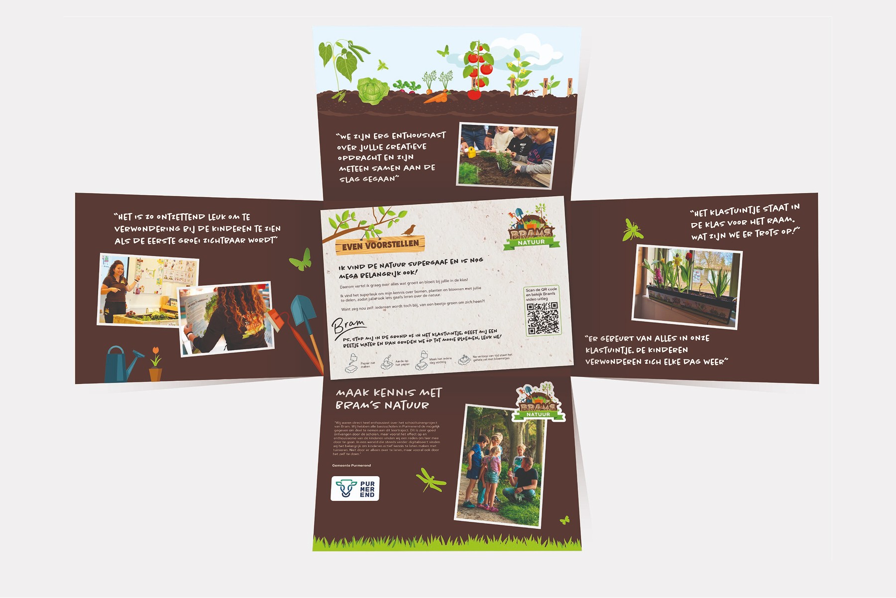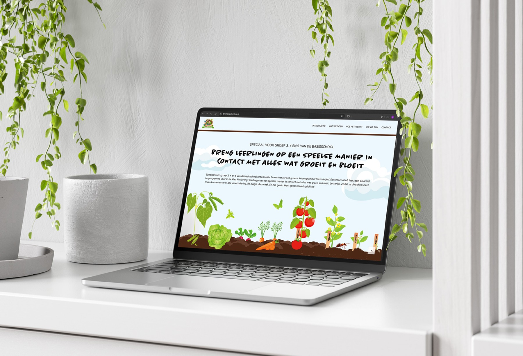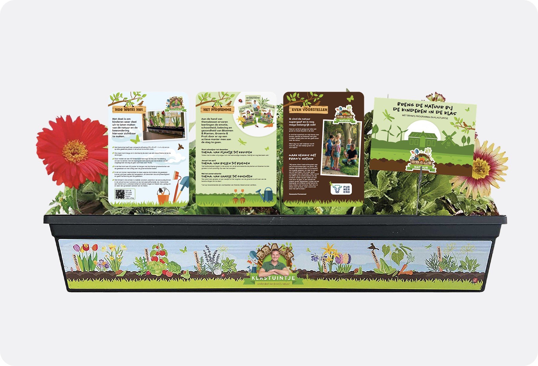 We hebben een speelse en levendige website ontwikkeld vol bewegende elementen die de beleving versterkt. Er is er een herkenbare sticker ontworpen voor op de plantenbakken, waarin informatieve kaarten geplaatst kunnen worden. Bovendien is er gebruikgemaakt van groeipapier – dit kan direct de grond in en laat kinderen meteen ervaren hoe iets groeit, van zaadje tot plantje.